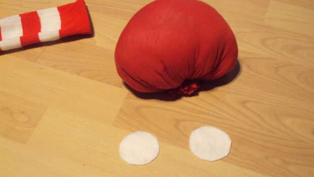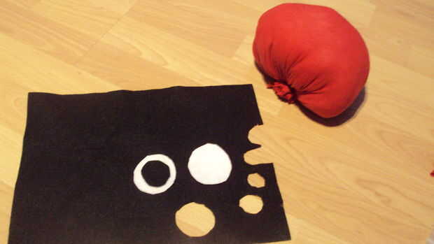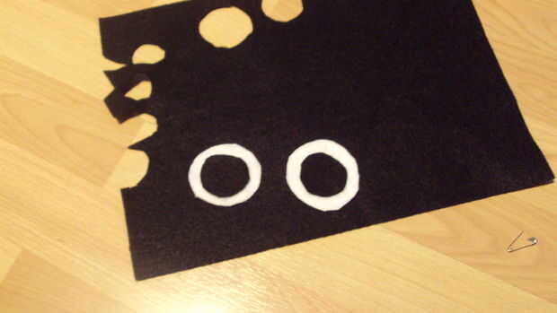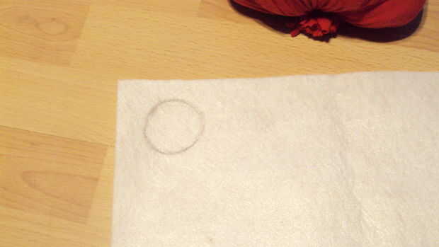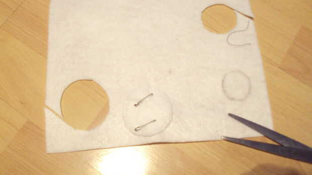 Con un lápiz o carbón negro, dibujar un esbozo de un gran círculo en el fieltro blanco y recortarlo. Recorte de lugar en otra parte del fieltro y asegúrelo con un pasador de seguridad. Corte alrededor de la abertura y hacer un círculo grande adicional.