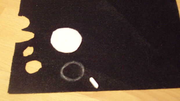 Con carbón vegetal blanco, dibujar un esquema de un círculo un poco más pequeño en fieltro negro y recortarlo. Como con el anterior recorte, coloque en otra parte del fieltro y fije con un alfiler, cortar otro círculo.