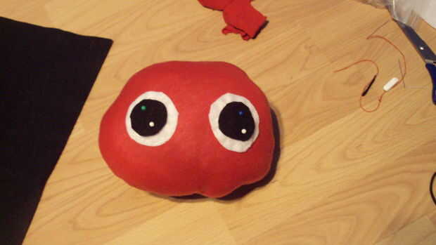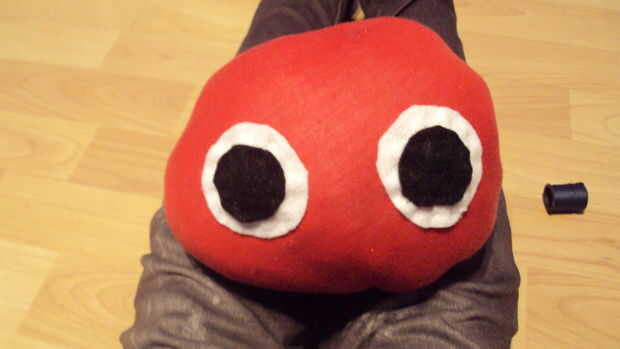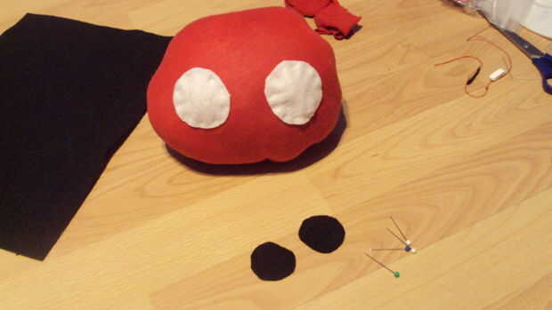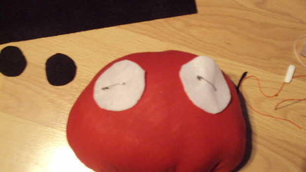 En la cabeza del pulpo, coloque el blanco en cada lado de la cabeza y asegúrelo con un pasador de seguridad. Con hilo blanco, coser en el fieltro.