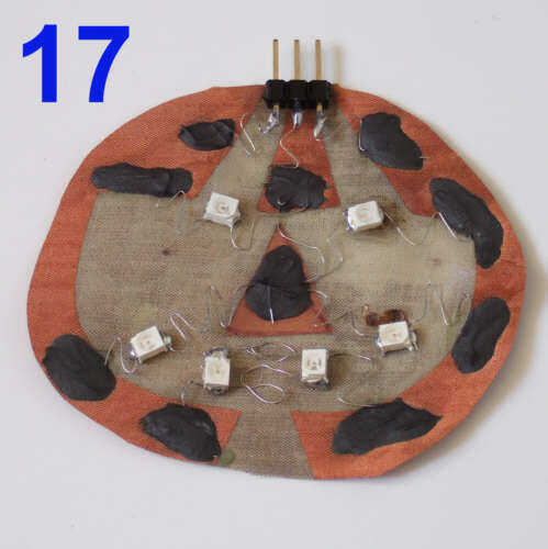 Pic18 muestra la cabeza de calabaza después de laminar con Oogoo naranja. El Oogoo fue cortado para exponer los LEDs. Silicona translúcida y de color la pintura entonces fue utilizada para terminar la cabeza de calabaza.