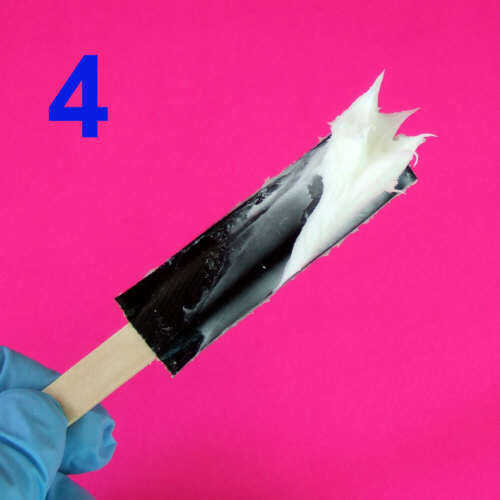 Como se dijo antes, Oogoo es simplemente una mezcla de sellador transparente de silicona y maíz almidón. Puede ser mezclada en cualquier lugar de 5 a 1 a 1 a 2 silicona para el almidón de maíz por volumen. Hasta cierto punto, el almidón de maíz más que añade más rápido creará. Me gusta mezclar en pequeños vasos desechables con un palito que se envuelve con cinta gorila para crear una espátula. Ver pic4. Una vez que se cura la Oogoo pela fácilmente apagado la cinta envuelta palo y el palo de mezcla/el separarse se pueden reutilizar.