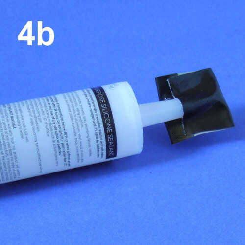Un problema recurrente con sellador de silicona es que una vez abierto, tenderá a establecer en la punta del tubo. Para obtener un buen sello he tenido buena suerte con cinta gorila envuelto sobre la punta. Ver pic4b. Si sale un boquete de pulgadas de trimestre entre la cinta envuelta y la punta puede exprimir lo suficiente silicona para sellar la punta bien de aire y la humedad.