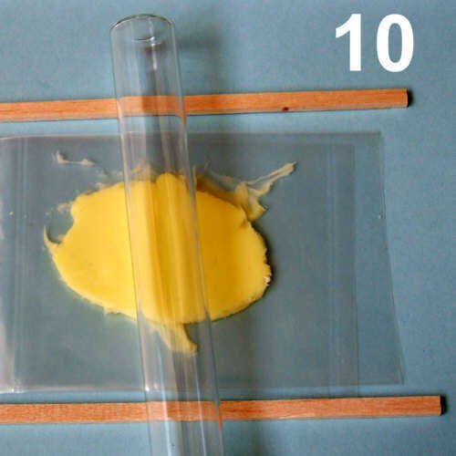 Es fácil hacer las hojas de Oogoo. Simplemente extiende una mezcla entre dos capas de polietileno transparente y luego rodar con un objeto redondo como si fuera masa de trabajo. Ver pic10. Me gusta usar plástico de polietileno de bolsas de congelación de galón. Si colocar espaciadores de madera fina o metal puede mantener el espesor uniforme.