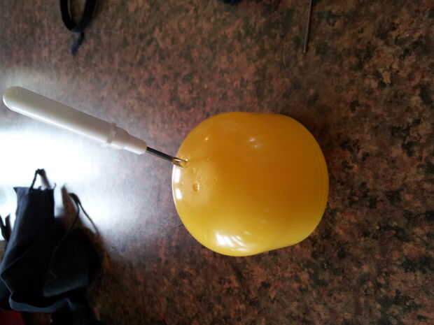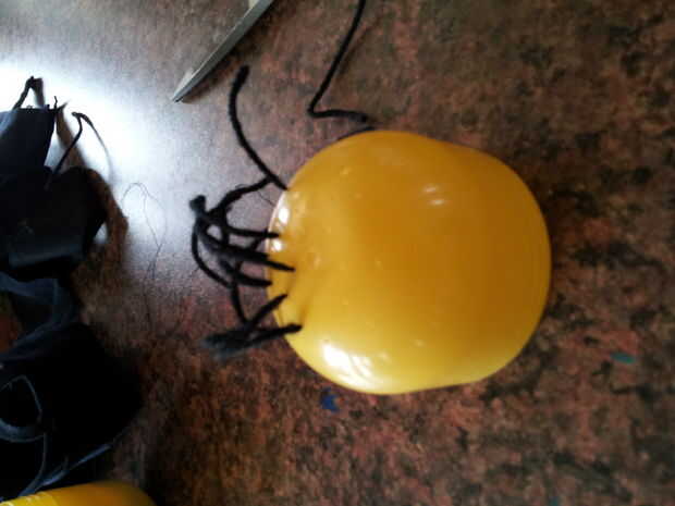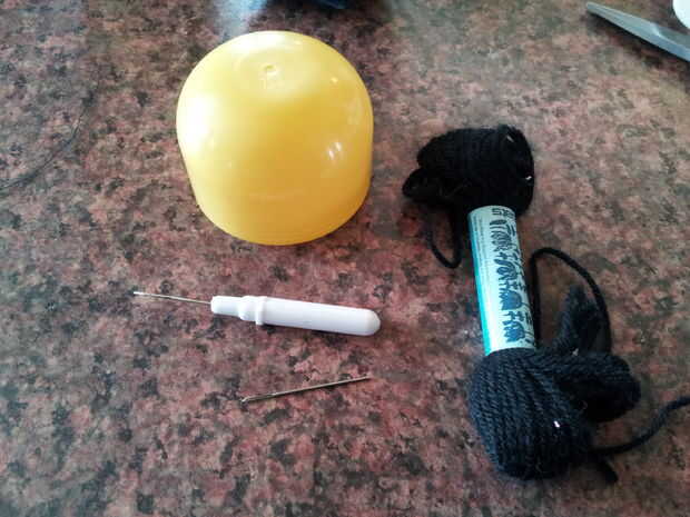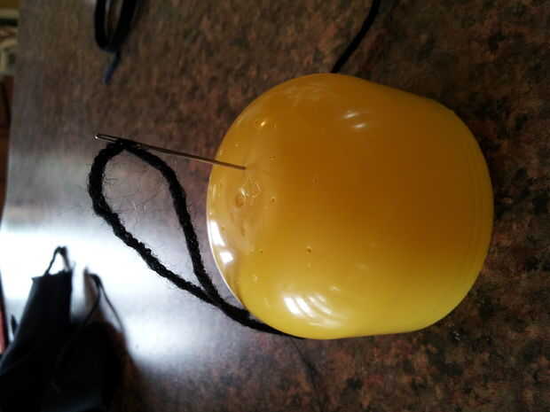 El súbdito en el mono azul tenía el pelo más realista de hilado. Al igual que los otros súbditos, empujar los agujeros en la mitad más pequeña de la cápsula utilizando a un descosedor. Tomar una hebra de hilo y el hilo en una aguja grande. A partir en el exterior de la cápsula Inserte la aguja en uno de los agujeros y tire de él mediante el uso de pinzas. Tire la aguja y el hilo hacia fuera otra vez a través de un orificio cercano. Tire el hilo hasta el primer fin es la longitud correcta y luego cortar el hilo en su extremo para que coincida con su longitud. Alternativamente, en lugar de cortar el hilo después de cada vez que tire el hilo a través de, deje el hilo en grandes bucles, luego cortarlas al final. De cualquier manera, seguir añadiendo el pelo hasta que esté satisfecho con cómo se ve.