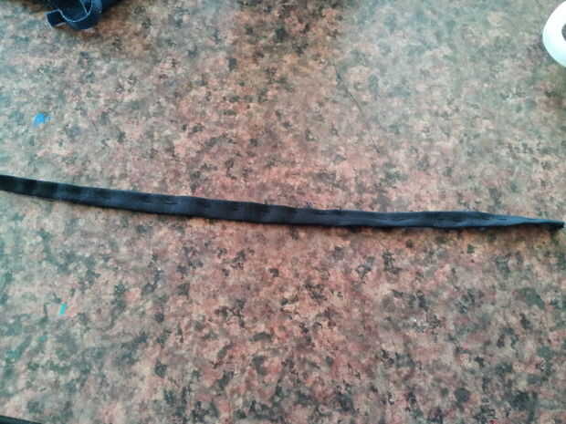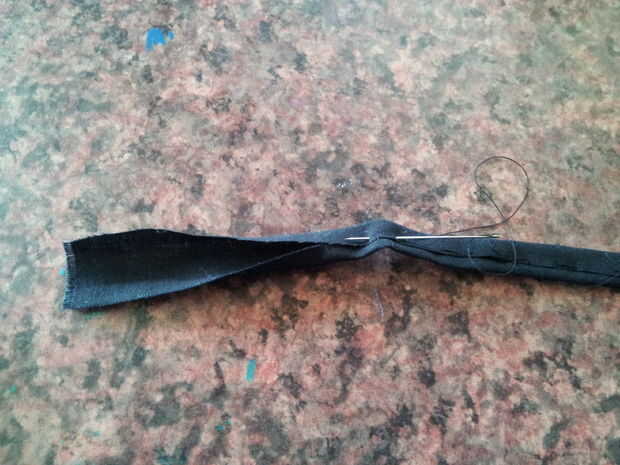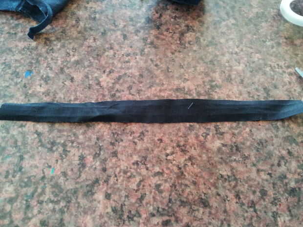 Para hacer la banda para las gafas, utilice una pequeña tira de material oscuro. Podría doblar y coser los bordes ásperos si quieres un look más limpio, o puede dejarlo como está. Pegue la tira a la mitad superior de la cápsula amarillo y luego colocar y pegar los ojos en la parte superior.
