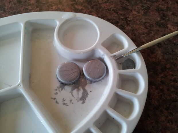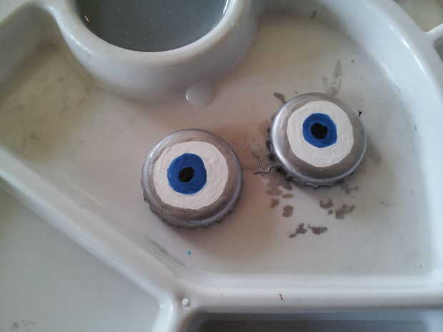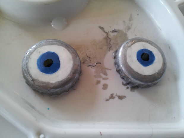 El súbdito en el mono azul tenía 2 ojos de botellas con tapas metálicas pintadas con pintura acrílica, y sellados, otra vez con el pulimento de clavo claro. Asegúrese de que la pintura esté completamente seca antes de aplicar el esmalte de uñas, o se mancha la pintura.