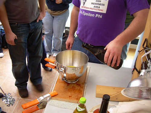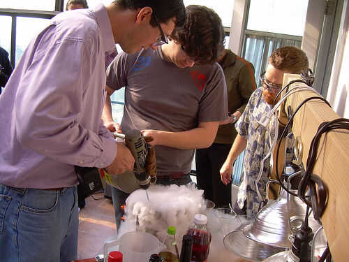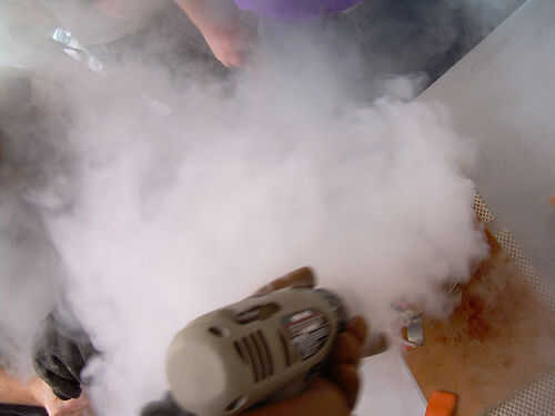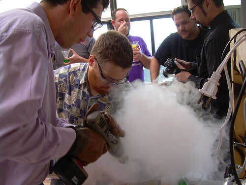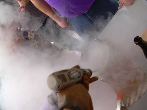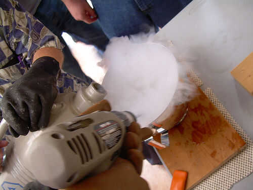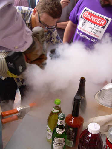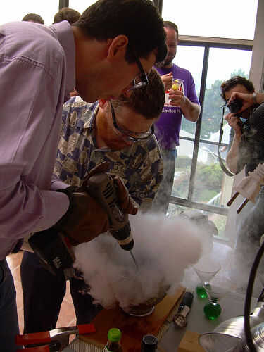 Mix it up. Aquí es la técnica de mezcla de dos personas: Ponga los ingredientes de la bebida en el recipiente. Vaya un poco de luz sobre el alcohol y un poco pesado en el mezclador, ya que el frío extremo hará que la bebida menos dulce de lo que sería. (No te preocupes, a ajustar las proporciones más adelante). Entonces LN2 vertedor... LN2 se vierte en el recipiente mientras que el agitador... revuelve la mezcla. Usted no será capaz de ver lo que está sucediendo, el vertedor vierte lentamente y se detiene cada cierto tiempo para permitir que el agitador ver en el recipiente.