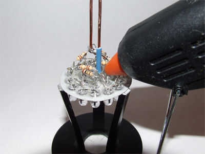 Todo ahora debe bastante rígida ya que se hicieron muchas soldaduras. Pero para su tranquilidad, utilice una pistola de pegamento caliente para llenar los boquetes para que ningún cable accidentalmente toca otro. Esto es opcional.