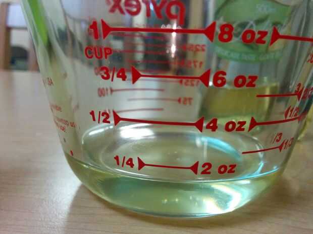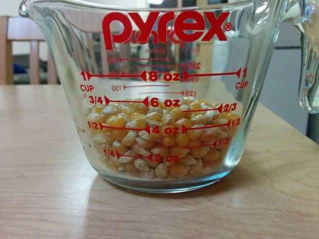 Luego Mida la mitad del volumen de palomitas de maíz en el aceite. Hasta la mitad una taza de palomitas de maíz =.25 taza de aceite.