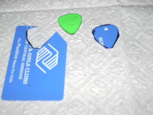 en este instructable mal enseñarle a hacer sus propias selecciones de la guitarra de regalo o tarjetas de créditoahora no tienes que conducir sobre a tu tienda de música sólo para conseguir frigging selecciones!barato, fácil y rápidono ha inventado e
