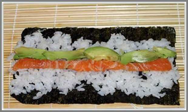 Tomar una estera de bambú y una hoja de Nori. Poner las algas en una estera, agregar arroz y extenderlo suavemente con una cuchara. La capa de arroz no debe tener ningún orificio. Al mismo tiempo, debe cubrir la hoja. Si no se pega el borde final, usted puede humedecer con vinagre de arroz. Habiendo hecho esto, coloque los vegetales en rodajas y los peces sobre la capa de arroz.