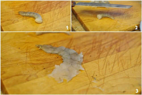 Poner camarones en tabla de cortar, usar chuleta de cuchillo y aplastar los camarones hasta que esté finamente picado.