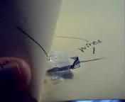 En la primera foto, la tarjeta es abierta y el interruptor está haciendo contacto. El lápiz las líneas representan los cables. En la segunda foto se cierra la tarjeta y no está haciendo contacto a causa de la cinta. Líneas de lápiz también representan la cinta. Dobló el papel para conseguir esa oportunidad. La tercera foto es el interior del botón.