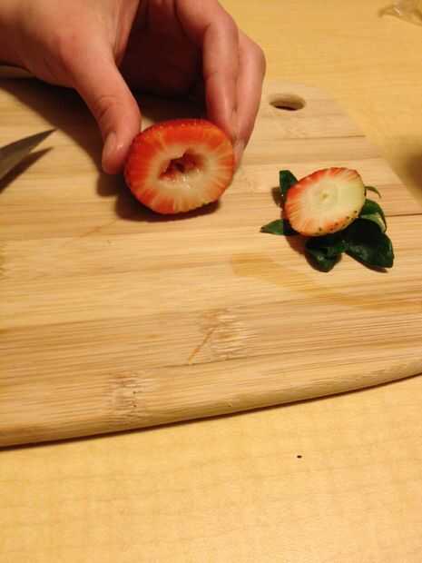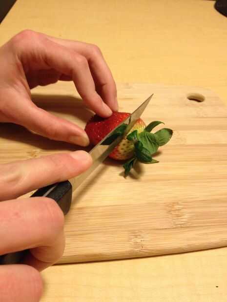 En una tabla de cortar, cortar los tallos de las fresas con un cuchillo justo debajo de la espiga. Tenga cuidado al usar el cuchillo es un objeto punzante. Repita este paso para cada fresa.