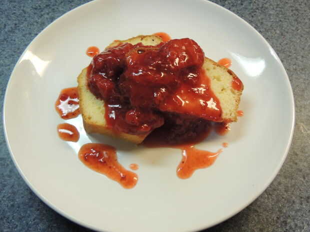 3. Usando una espumadera, añadir trozos de fresas en el centro de la torta de la libra.