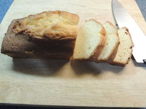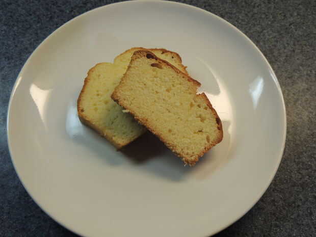 1. Tomar un trozo de bizcocho y cortar en 1/2 en rebanadas.