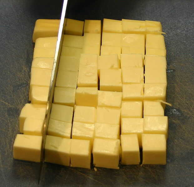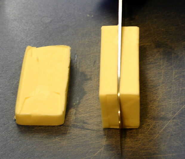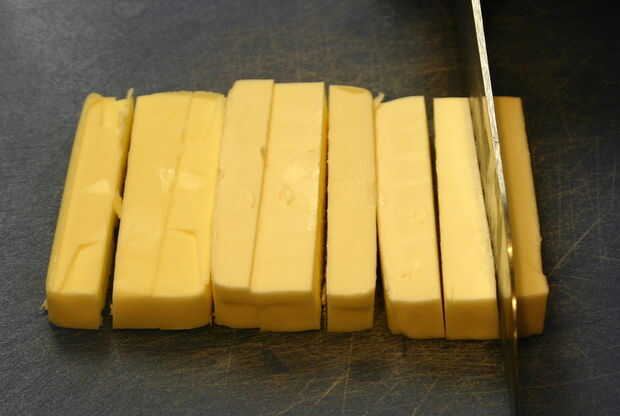 Desenvolver la mantequilla y cortar en porciones de pequeños cubos. Yo generalmente hacer tres cortes a lo largo, tirón de las losas, darles otro tres cortes a lo largo, luego golpea los palillos en los cubos.