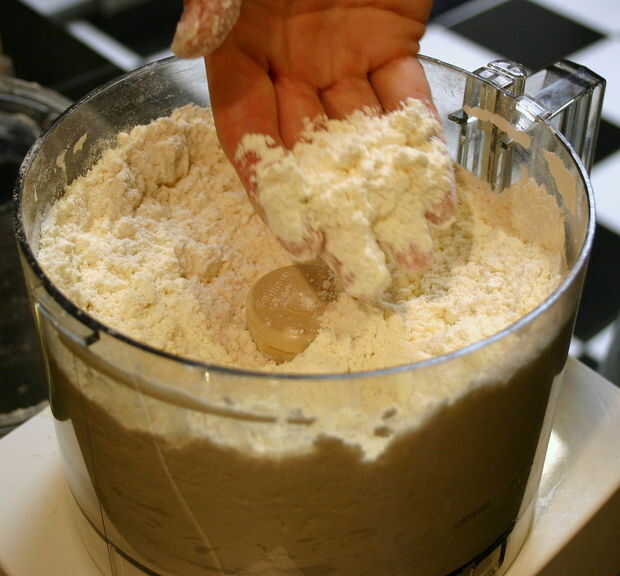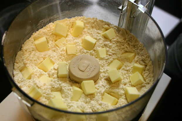 Continúe hasta que todos los cubos de mantequilla en el recipiente procesador de alimentos y pulse hasta que la mantequilla se ha convertido en pequeños pedazos de arena, unos 30 segundos. Algunos trozos más grandes están muy bien.