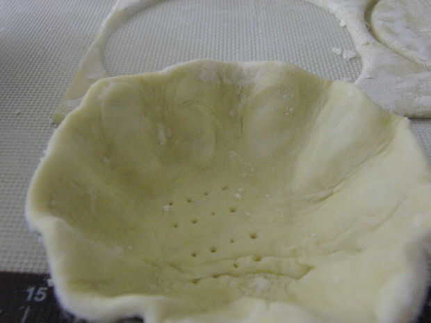 Coloque los círculos de masa sobre la bandeja y presione la masa. Empujar los agujeros en el fondo con un tenedor.