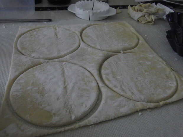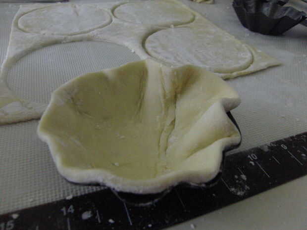Antes de empezar a hacer las tartas de huevo, asegúrese de descongelar la masa de hojaldre congelado durante unos 20 minutos y la mantequilla también los recipientes que están utilizando. Después, desdoble la hoja y cortar grandes suficiente círculos para encajar en sus moldes. He utilizado moldes individuales que eran un poco grandes en comparación con una tarta de huevo normal, así que corté 4 círculos en una hoja.
