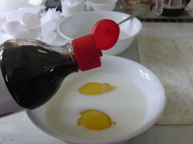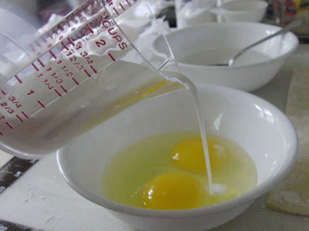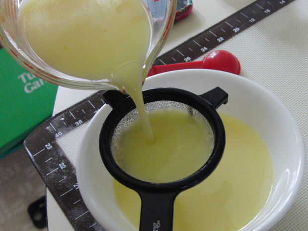 En otro recipiente, combinar los huevos, leche, extracto de vainilla y la sal y batir hasta que quede suave. A continuación, combinan las dos mezclas. Después, use un colador y colamos la mezcla dos veces. Este es el secreto para asegurarse de que el relleno es suave y sedoso :)