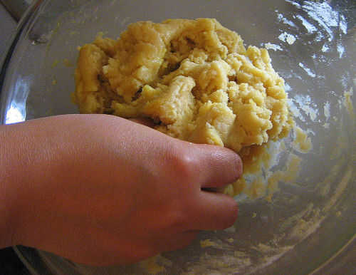 Después de agregar los ingredientes, use su mano para amasar la masa. Puede detener el amasado si se pone la masa suave y flexible.