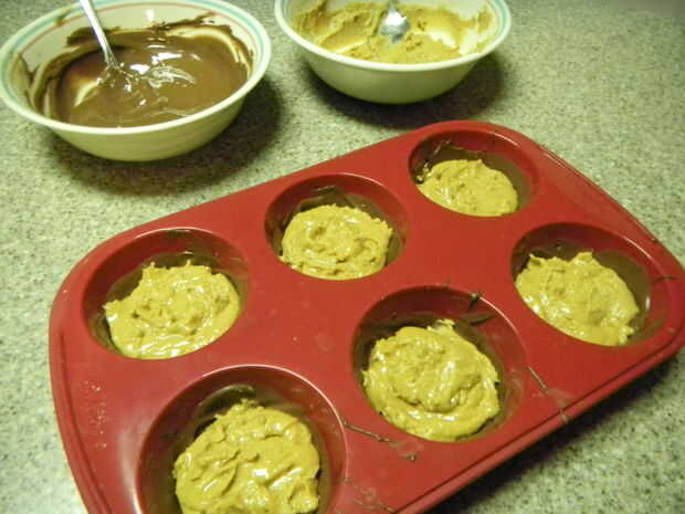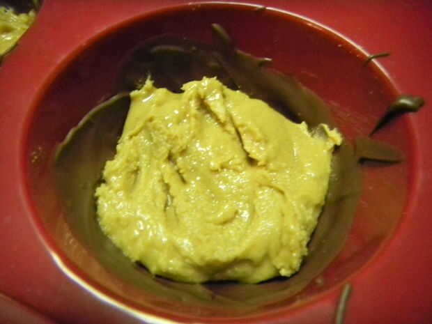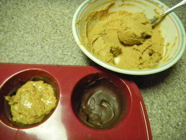 Hay que ir, 8 sencillos pasos, y ahora se hace el relleno de mantequilla de maní. Tomar su chocolate del nevera/congelador, y colocar algunos mantequilla de maní en cada taza.
