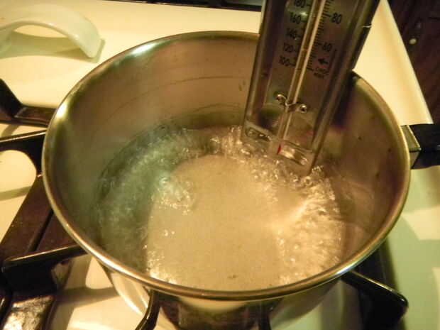 - Su termómetro de caramelo en su mezcla de azúcar y agua y calentar hasta que llegue la etapa suave de la bola: 245 – 250° F (Foto 2)