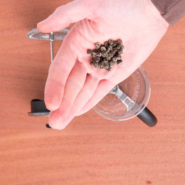 Mientras que el agua esté hirviendo, añadir la cantidad deseada de té seco deja a la jarra de la prensa francesa. Por ejemplo, en una prensa de cuatro tazas, puede que desee agregar alrededor de un cuarto de una taza de té seco.