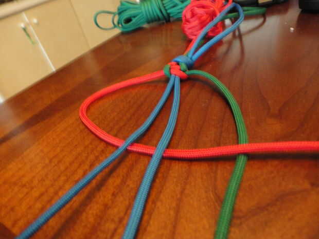 Ahora toma el filamento opuesto y traerlo en las secciones medianas y sobre la hebra exterior paracord. (Me tomé el filamento rojo paracord y trajo en los hilos azul mediados y sobre las mechas verdes.