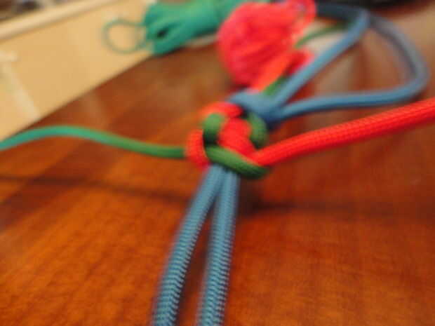 Ahora apriete tirando de cada lado de los filamentos de paracord exterior y tire la tela hacia arriba.