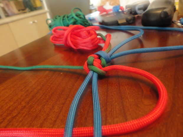 Ahora llevar la hebra roja debajo de los hilos azul mediados.