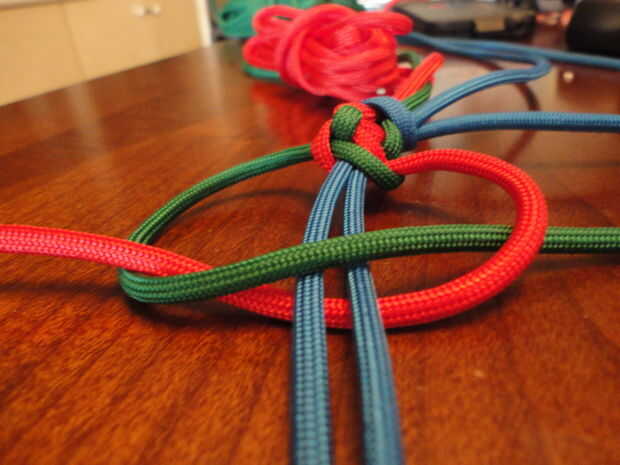 Ahora llevar la hebra verde sobre los hilos azul mediados y a través del espacio en el paracord rojo.