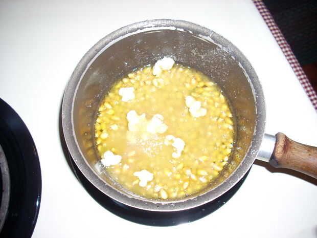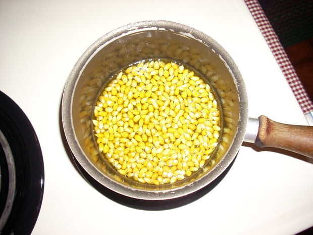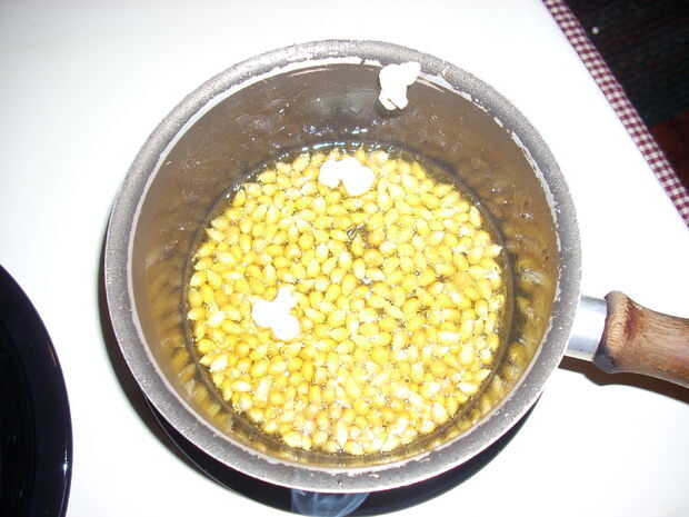 Después se calienta un poco, el aceite comenzará a burbujear y las palomitas de maíz comenzará a hincharse (esto tardará unos 2-3 minutos). Tan pronto como un par de núcleos pop, espolvorear el azúcar sobre las palomitas y coloque la tapa sobre la olla.
