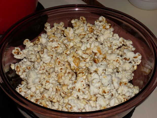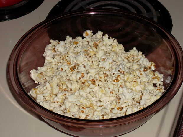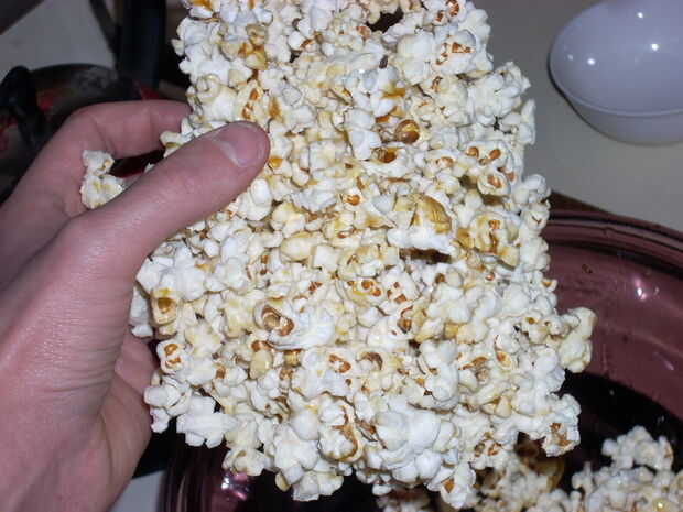 Después de 5 minutos que te darás cuenta que la mayoría de las palomitas es pegarse juntos en un grupo grande. A romper este grupo con la mano hasta que hay sólo pequeños montones de granos de 1-3. Luego agregar la sal por aspersión en la parte superior y mezclando todo con la mano.