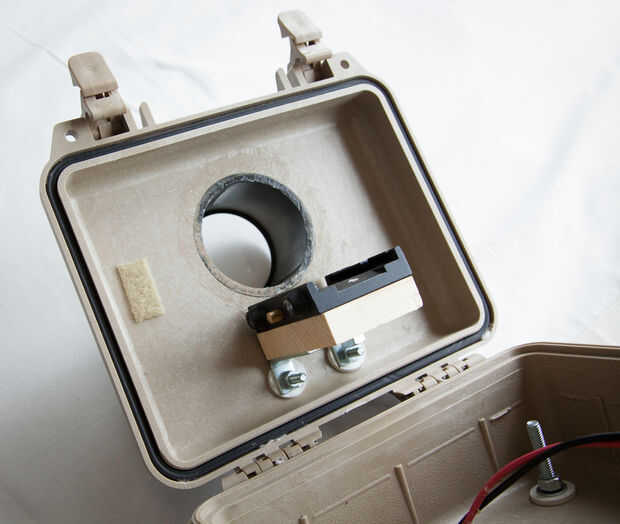 Utilizando una broca de taladro cortador de círculo que es un poquito más pequeña en diámetro que el tubo de PVC, corte un agujero en el frente de su caso Pelican. He utilizado un taladro de columna como se puede ver, pero funciona bien un taladro de mano.