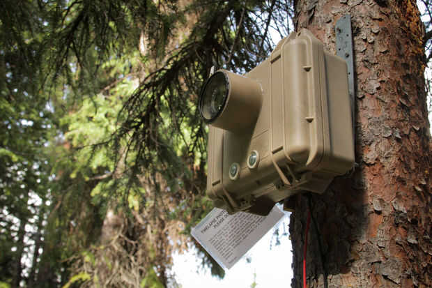 Fue nuestro otro arreglo de montaje conectar la caja de la cámara en un árbol y pase los cables a la caja de batería descansando en el suelo, o sí mismo montado en un árbol por separado. Instale los pernos de montaje en la caja de la cámara a los soportes de metal plana. Con largos pernos, tuercas y arandelas, usted será capaz de ajustar ligeramente la posición de la cámara por el alargamiento y el acortamiento de los pernos que conectan los cuadros de la cámara y la batería. Luego, con tornillos de madera largos, coloque los soportes (y la caja de la cámara) al árbol, post etc..