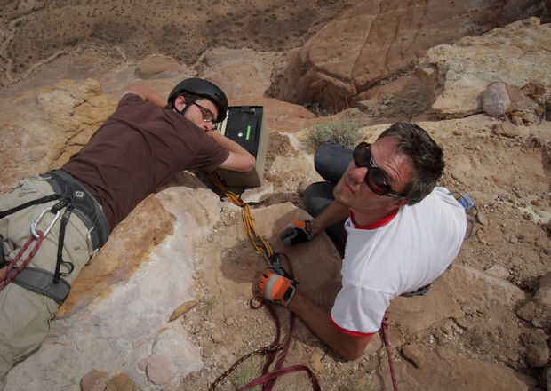 Cuando estés listo para colocar la cámara, usted encontrará que precisa colocación y montaje será clave - y difícil. Viajamos con varias opciones de montaje diferentes y utilizados algunos en el lugar. El valor predeterminado establecido fue de la caja de la cámara conectada firmemente a la caja de batería. Utiliza esta configuración para colocar la plataforma en esa ladera y también pulgadas desde el borde de un acantilado de 300 pies con vistas al lago Powell; Cubrimos ambas cámaras con las rocas para el camuflaje y para protegerlos del viento.