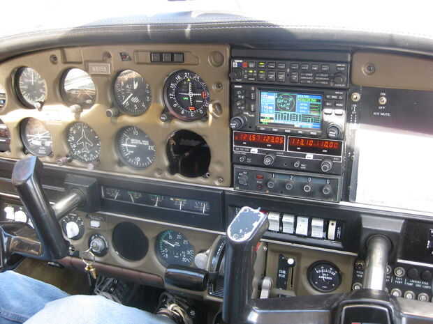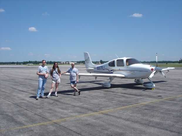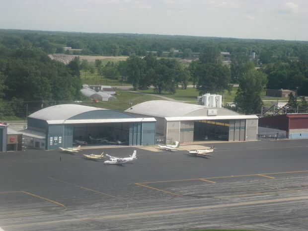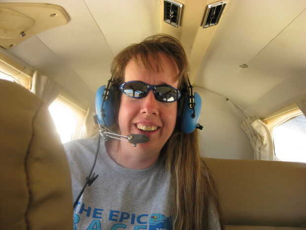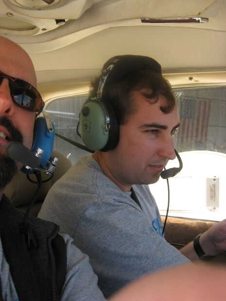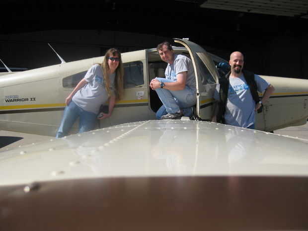 En nuestra primera visita, nuestro vehículo era demasiado alto para el estacionamiento, así que paramos en Servicios de vuelos nacionales. Eran lo suficientemente amables para nos dejó hacer una foto en la pista con uno de sus aviones. En nuestra segunda visita, gracias a Brian se licencia para volar, tenemos el punto de vista del piloto del aeropuerto su vuelo club Piper Warrior II.