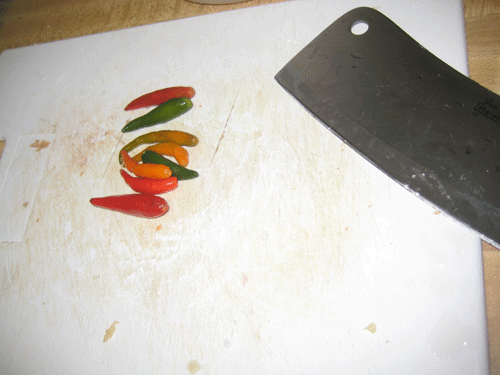 a continuación, obtener sobre 5-10 chiles tailandeses. Dependiendo de lo picante que quieras la sopa que, usted querrá agregar más o menos. Como me agrego generalmente 15-20 chiles, y me gusta requete picante sólo añadir poco poco en un momento si usted no puede manejar el picor.
