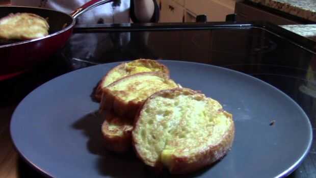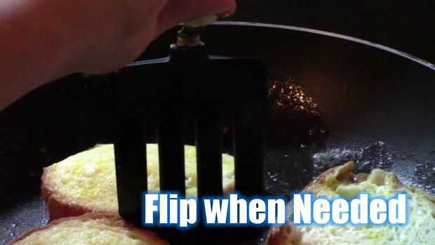 Ambos lados de tu pan en la leche de la inmersión + huevos mezclan y empiecen a cocinar, colocando sobre la bandeja. No Remoje el pan en la mezcla durante demasiado tiempo, pueden llegar a ser caldoso. Sólo una inmersión rápida en ambos lados es todo lo que necesita. También, voltear el pan con una espátula cuando es visualmente evidente que una parte ha terminado de cocinar.