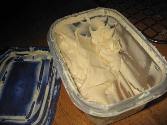 En la siguiente. Usando la batidora eléctrica, batir queso crema y la mantequilla en un tazón grande. Poco a poco venció en azúcar en polvo. ¿Cuánto? Bien... Salió la receta porque empecé con un recipiente grande de azúcar en polvo en lugar de una caja de # 1. Guesstimating como mezclé, yo solo seguí agregando azúcar hasta que el glaseado había logrado una rigidez frostinglike. Al darse cuenta que sería añadiendo caramelo caldoso, dirigido para rigidez adicional. Entonces comencé a batir en el caramelo enfriado. Esto es donde usted realmente puede ir a la ciudad con una batidora eléctrica. Batirlo!
