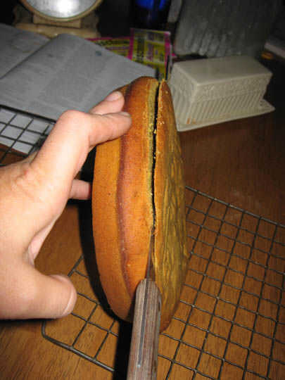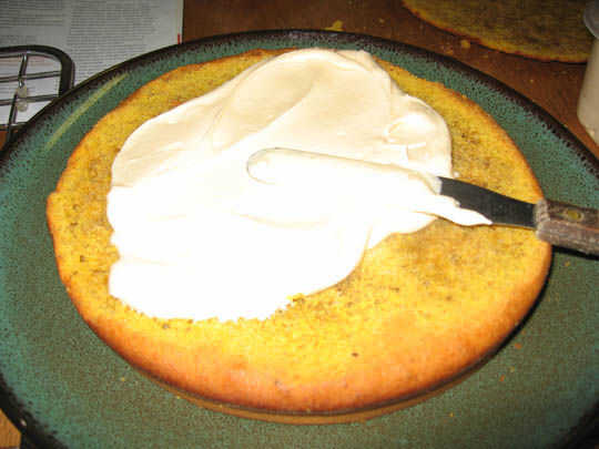 Colocar 1 capa de pastel sobre un plato, cortar del lado de. Extensión sobre un 1/4 de la cubierta en la parte superior. Comenzar con una pasta grande en el centro y trabajar suavemente su camino usando una espátula de helar o un cuchillo embotado muy amplia. Ir hasta el borde, tal vez un poco más. Recorrido sobre el dogs(large) en la forma de agarrar el segundo pastel. Maldición y agarrar los dedos del pie, saltando arriba y abajo. Coloque el pastel de 2 º, parte cortada hacia abajo, sobre la capa helada. Helada la primera superior y luego los lados, suavizado a su satisfacción. Agregué algunas cerezas desecadas y los arándanos para la decoración - use su imaginación y ser creativo con la presentación.