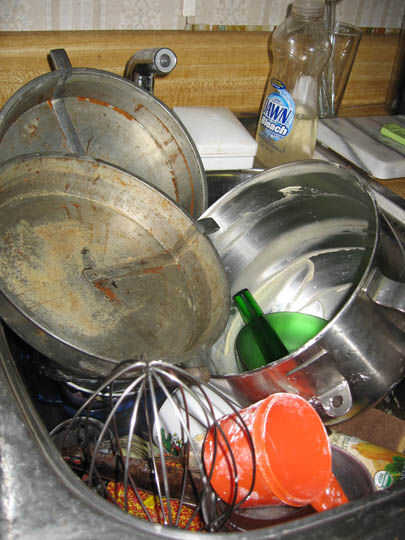 Encuesta sobre el enorme montón de utensilios de cocina sucios con ansiedad y para el lavavajillas. Pregunta si el resultado final vale la pena