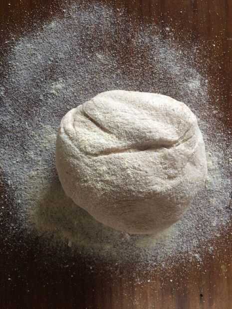 Hacer la masa de pan plano favorito. Éste se inspira en Tartine Bakery en San Francisco en su libro de cocina #3. Utilicé harina de kamut para obtener una masa dorada y transparente.