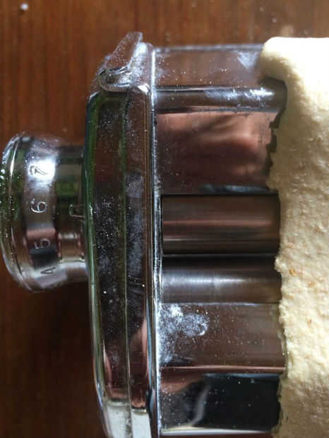 Procesar la masa a través de la máquina hasta la posición #6. En este punto, la masa será muy delgada. En cada ajuste, asegúrese de que no hay harina en la superficie donde puede descansar la masa entre ajustes sin pegarse. Una vez en configuración #6 está listo para decorar. En este punto la masa es muy frágil.