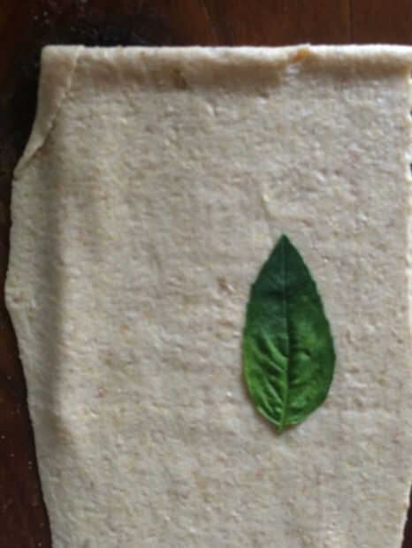 Tomar la tira de masa fina y decorar la mitad de ella. Luego doblar la otra mitad vacía sobre la mitad decorada como un sándwich. Pat ligeramente para sellar.