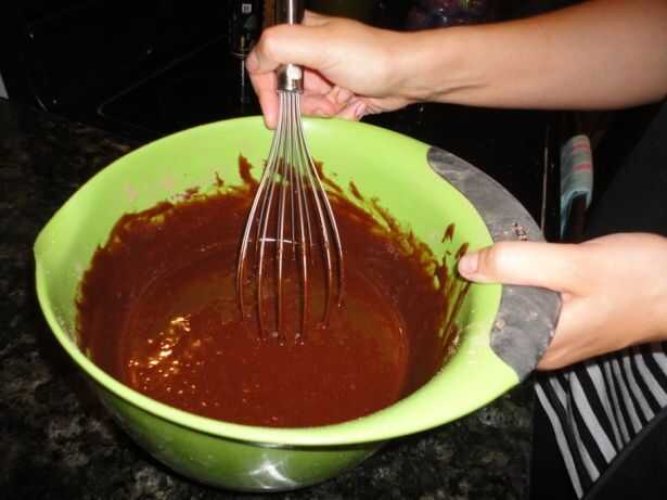 Vierta la mezcla líquida de agua, aceite vegetal y huevos en el recipiente grande que contiene el brownie mezclan y remover con el batidor de huevo durante 2 minutos o hasta que la masa es suave y menos global.