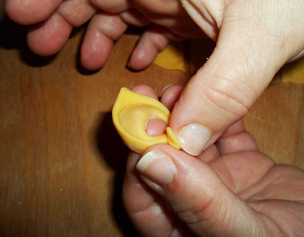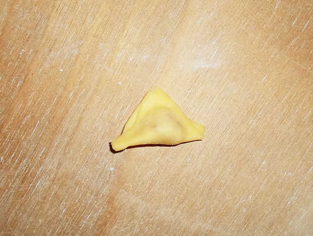 Dejar el ángulo medio del triángulo en la parte superior y se unen los ángulos de lados, trayendo delante del "vientre" del tortellino :)