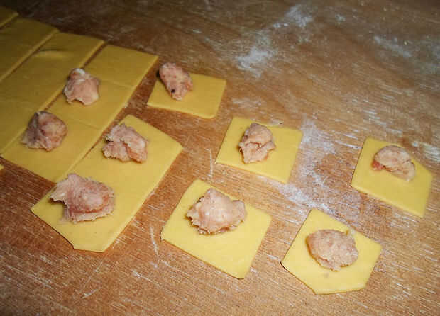 Una vez que haya terminado de cerrar todas sus plazas, tome otro pedazo de masa, pasarla por la máquina de pasta, cortar cuadrados y hacer tortellini nuevo!